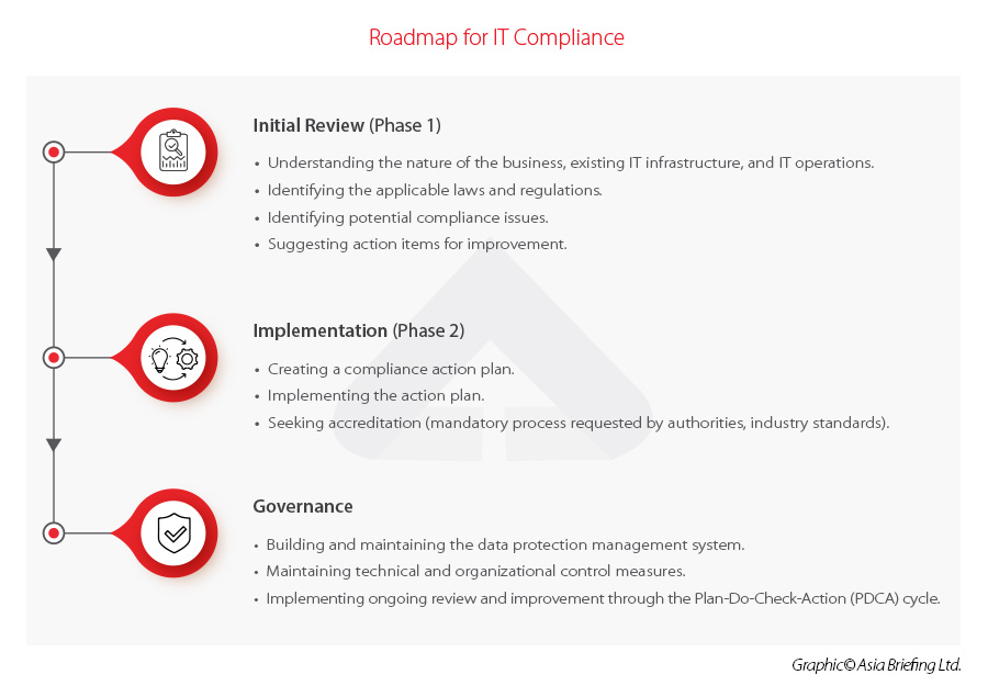 A thorough analysis is a good starting point for compliance, but the key is taking action. The most important thing is not to panic when faced with the complexity of China’s regulatory environment and the consequences of noncompliance. However, we urge companies against inaction and advise them not to passively wait for further detailed guidelines. A prompt action plan should be created and followed to set out on the path toward meeting compliance targets. Below is a template roadmap toward achieving compliance in China.