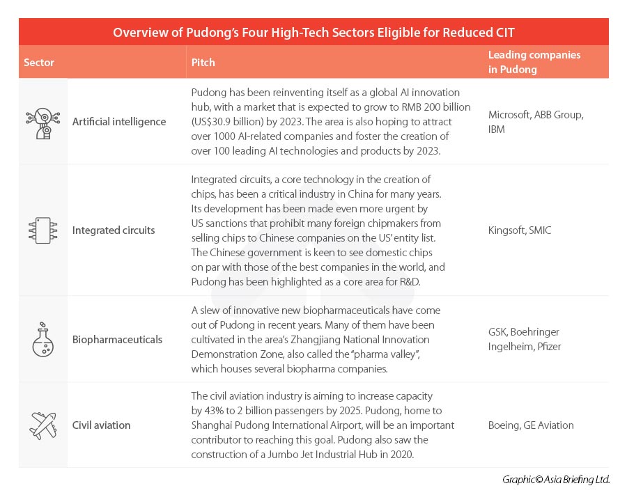 Pudong has become a core engine for sharpening China’s competitive edge in high-tech sectors, and Shanghai has singled out four key sectors for boosting innovation: artificial intelligence (AI), integrated circuits (IC), biopharmaceuticals, and civil aviation.To this end, a set of guidelines released on July 15, 2021 proposed a 15 percent corporate income tax (CIT), reduced from the national standard of 25 percent, for companies engaged in these four sectors in “specific areas” of Pudong. This policy is an expansion of a similar policy effective in the Lingang New Area of the Shanghai FTZ.