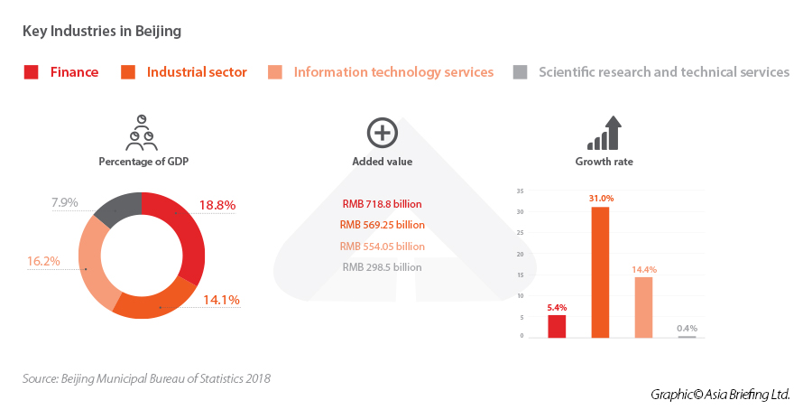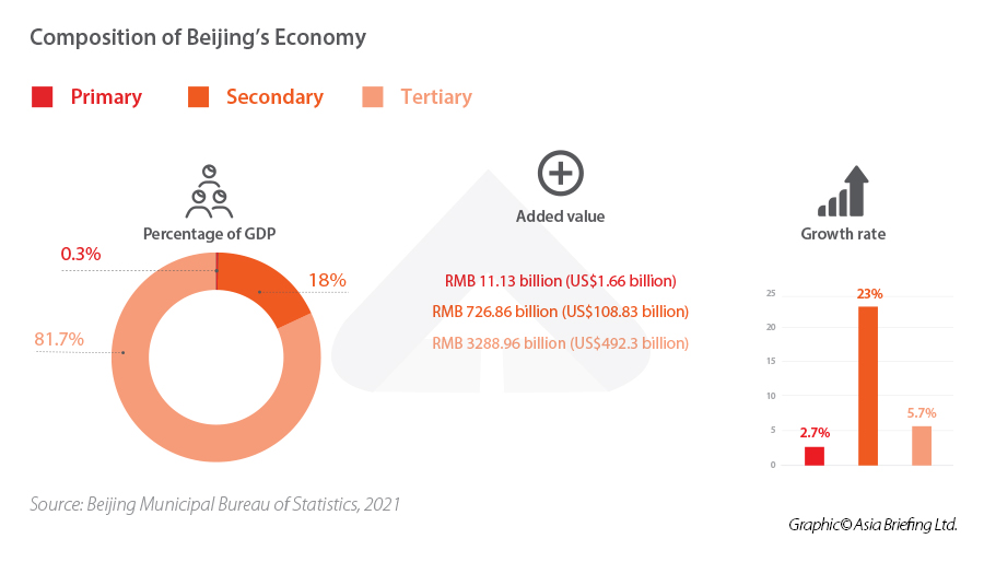 The city is largely a post-industrial economy and has the biggest tertiary industry as a proportion of GDP among all Chinese cities. In 2021, Beijing’s tertiary industry, or service sector, accounted for over 80 percent of the city’s GDP, while the secondary industry, or manufacturing sector, accounted for most of the remaining 23 percent.Sector-wise, Beijing has highly-developed financial, service, R&D, cultural, and education industries.