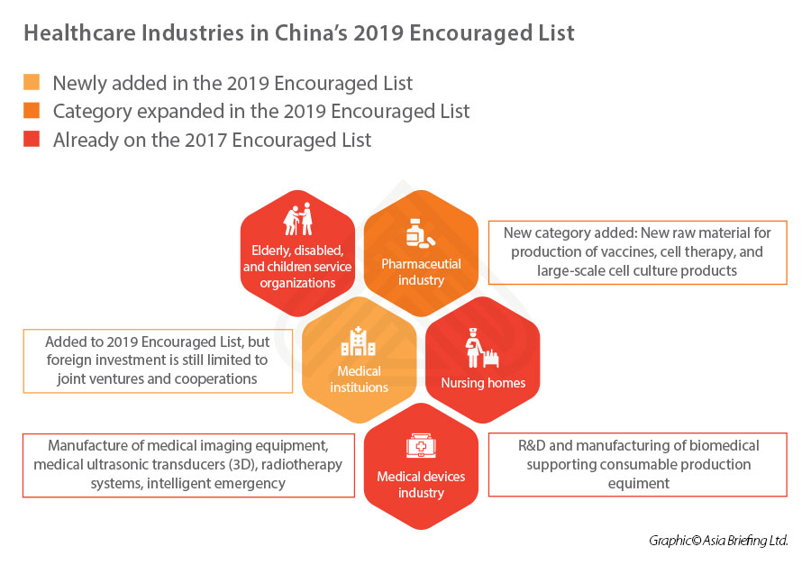 In terms of foreign investment, the healthcare industry has been steadily opening up to foreign participation – both in terms of removal of items in the National Negative List, and the addition of items on the National Encouraged List. In 2019, “new raw material for the production of vaccines” and “medical institutions” were newly added on the 2019 National Encouraged List, which means that they are now encouraged investment sector by the central government, unlocking opportunities for foreign investors to access preferential policies and tax rates.