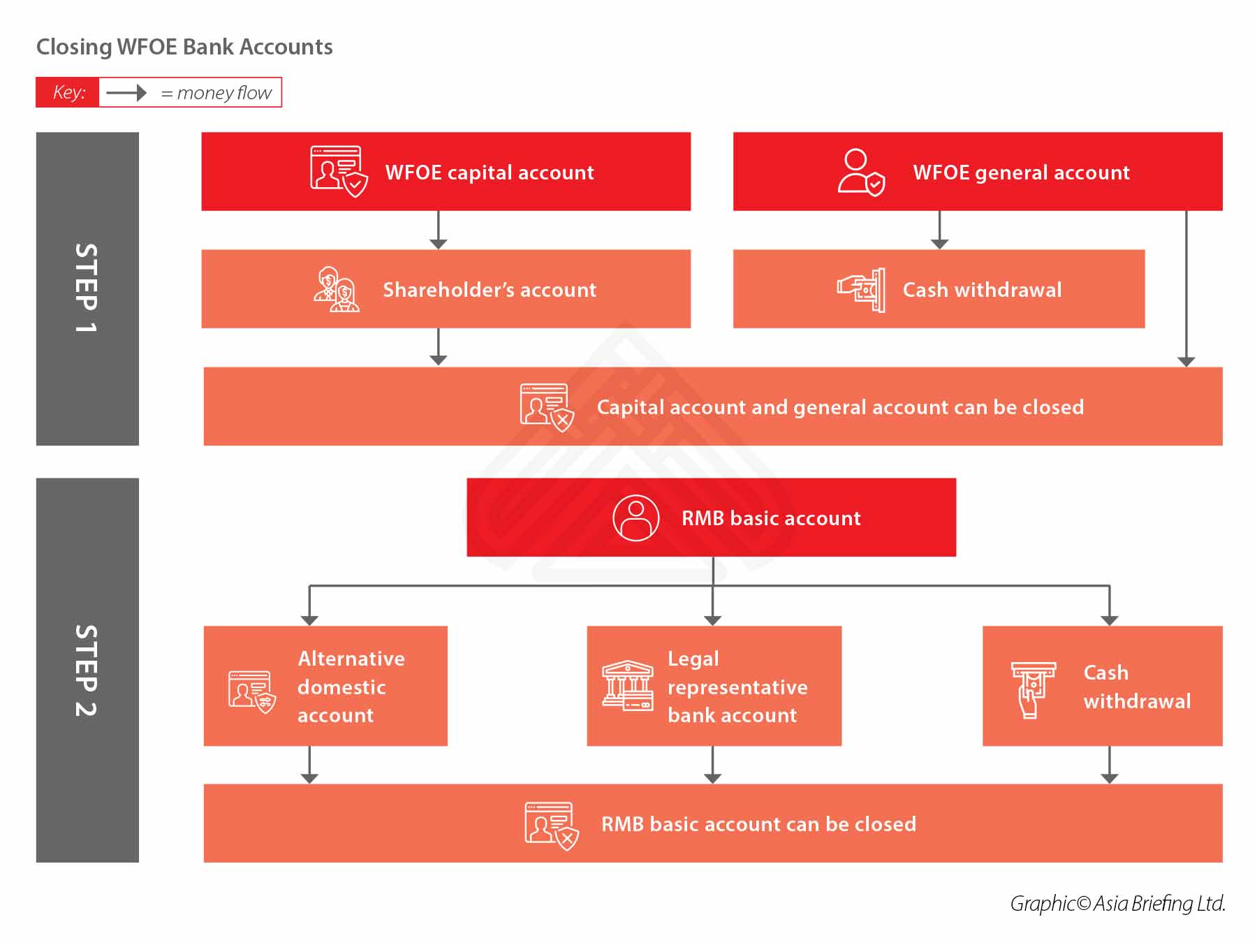 - All bank accounts (except for the RMB basic account) shall be closed before SAMR deregistration. The balance in those account(s) shall be transferred to the RMB basic account.