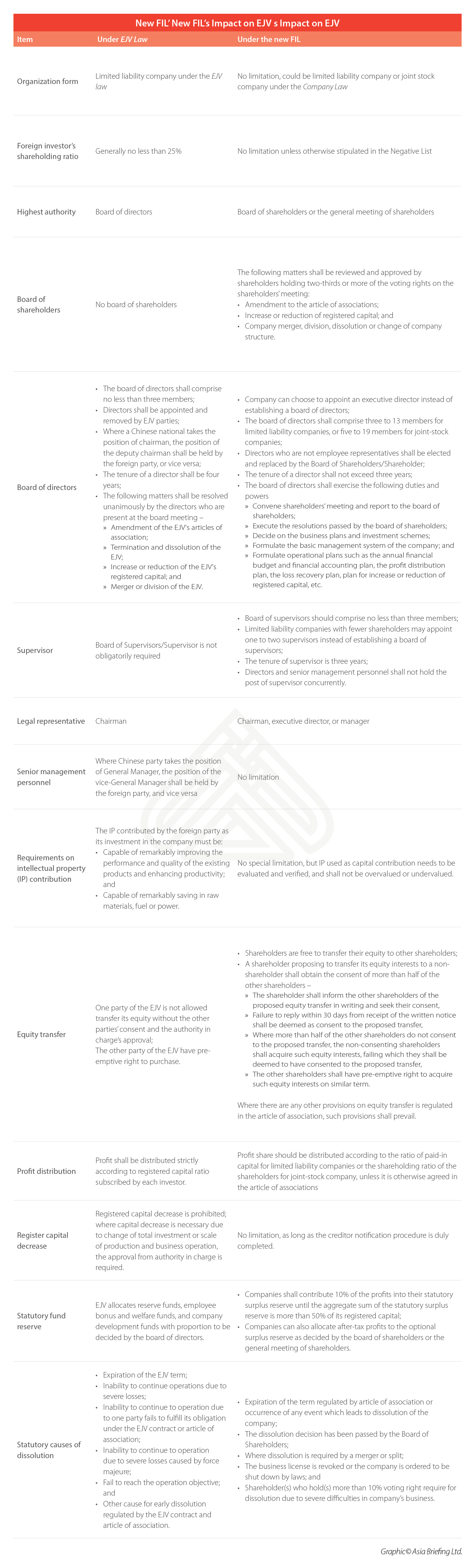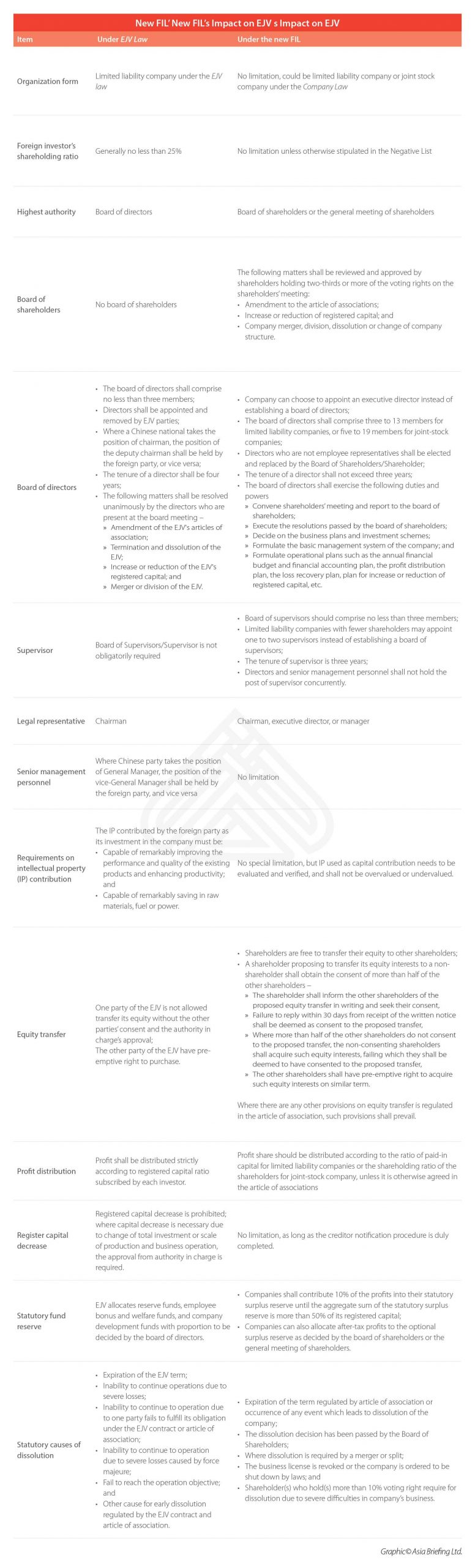 After the FIL is fully implemented, there will no longer be FIEs in the form of CJVs. Existing EJVs will need to amend their article of associations and change their governing structure and operating rules within the five-year transitional period, in accordance with the Company Law.