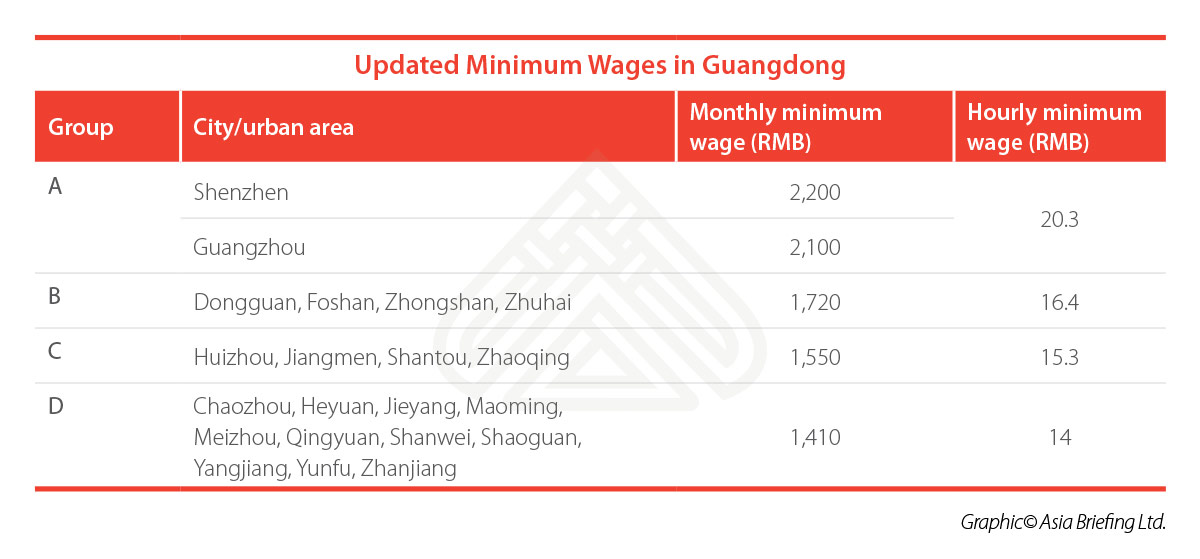 - Group A: This is the tier for Guangdong’s most developed cities. In this category, Shenzhen increased the monthly minimum wage from RMB 2,130 (US$322.58) to RMB 2,200 (US$333.18), while Guangzhou will increase it from RMB 1,895 (US$286.99) to RMB 2,100 (US$318.03).