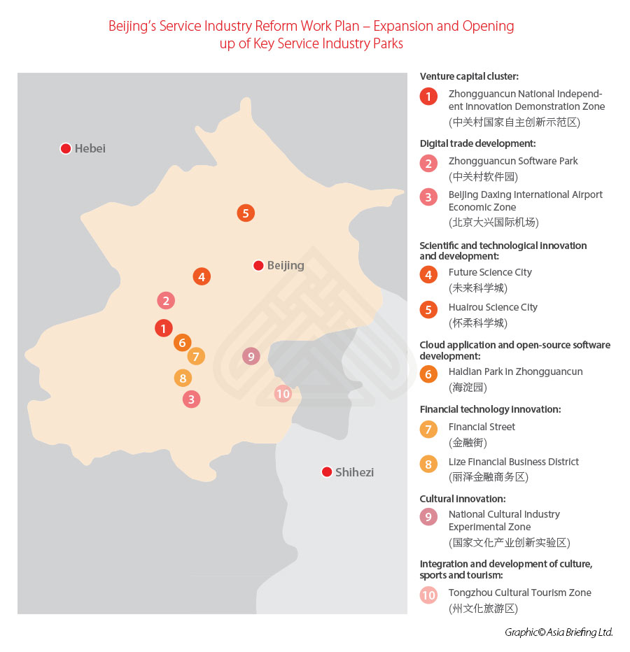 - In September 2020, Beijing released the Work Plan for the Construction of a New Service Industry Comprehensive Demonstration Zone – marking the fourth and latest round of Beijing’s service industry opening-up.