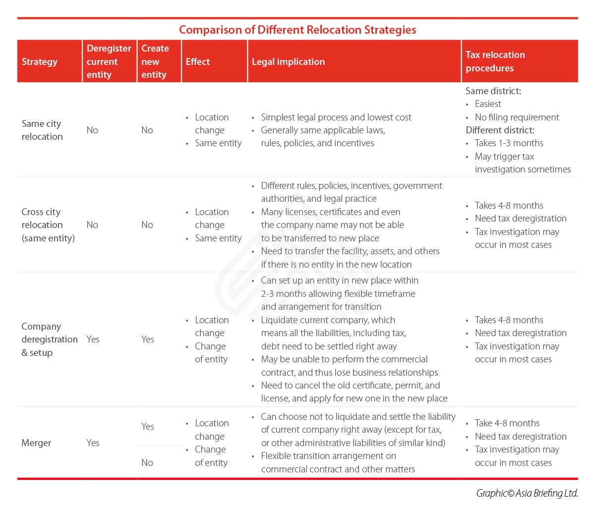 Under this strategy, the enterprise can continue as the same legal entity, which means the commercial contracts it reached with others, and legal liability arising before the relocation will be continued as well.