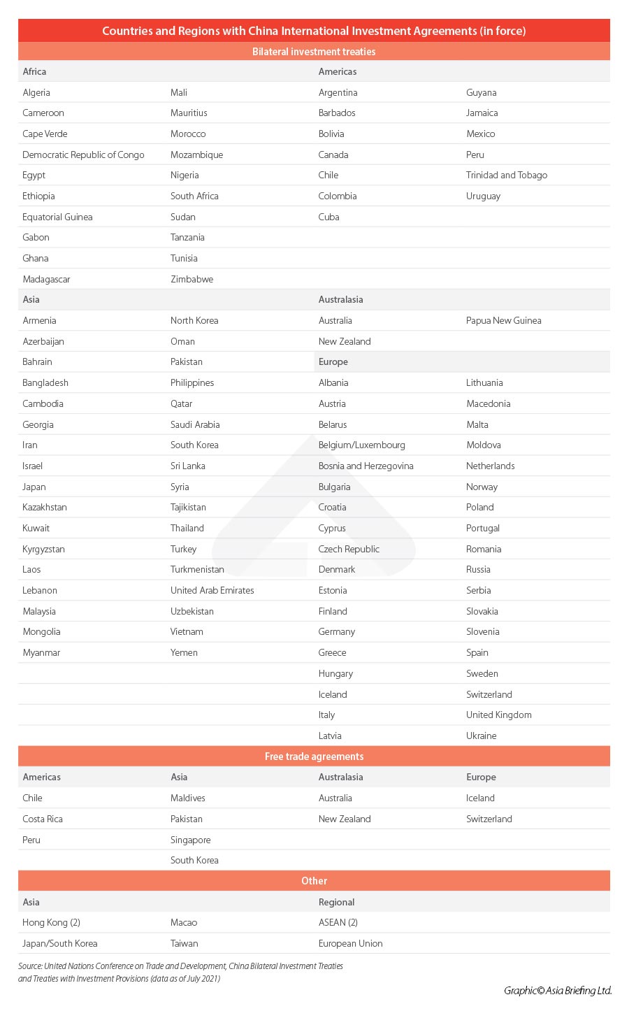 According to the United Nations Conference on Trade and Development (UNCTAD), China has 107 BITs in force as of 2021. It also has active IIAs and FTAs with a further 17 countries and regions.