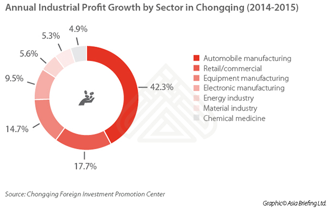 The Chongqing government actively promotes the electronic information and electronic manufacturing industry, as well as other emerging industries like high-end equipment manufacturing, chemical medicine, new materials manufacturing, and new energy industry. In 2015, electronic manufacturing was the third fastest growing industry by profit in Chongqing, after automobile manufacturing and retail/commercial.