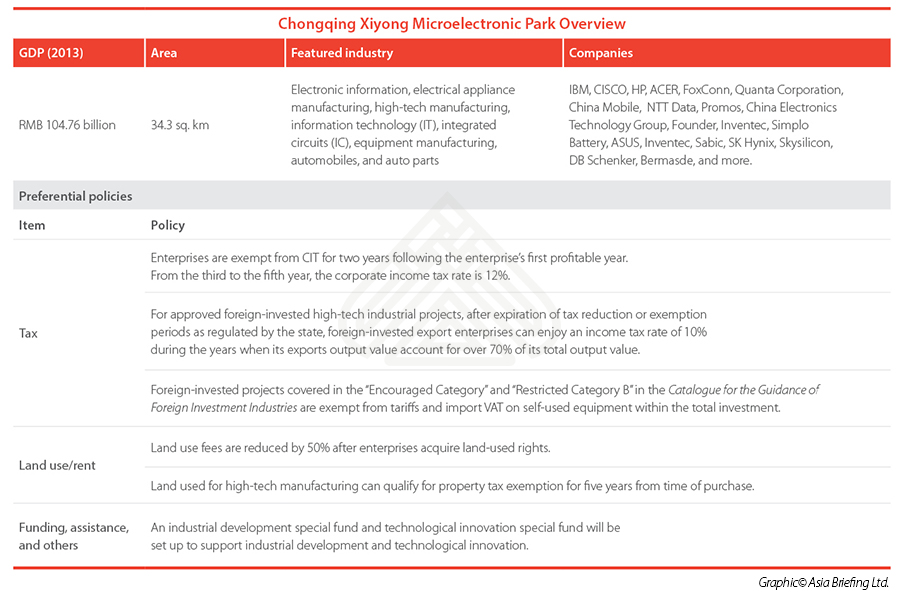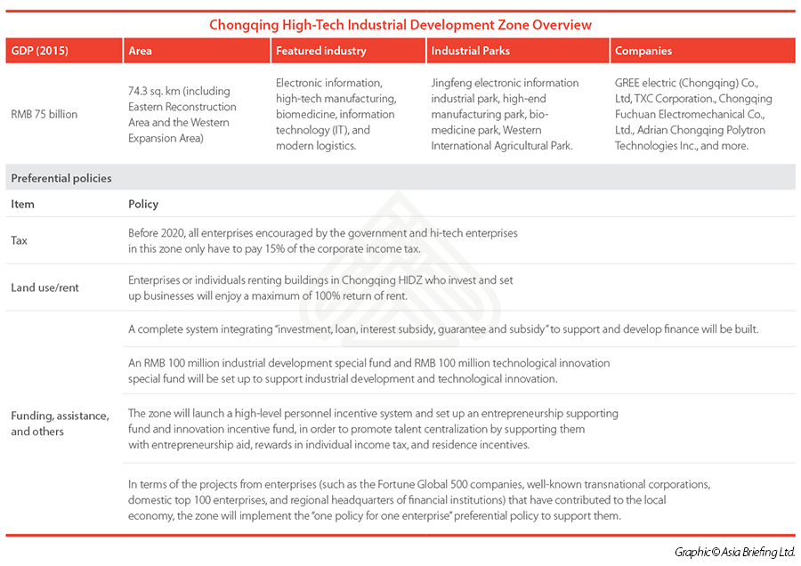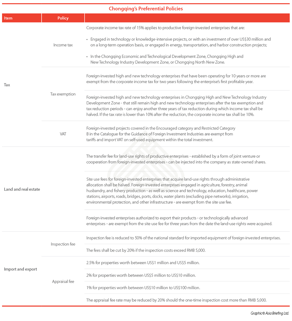 Preferential policies are often offered through industrial parks that seek to develop certain industries. In order to assist foreign investors better assess their investment opportunities in Chongqing, this article explores three key industrial zones and their preferential policies for foreign businesses.