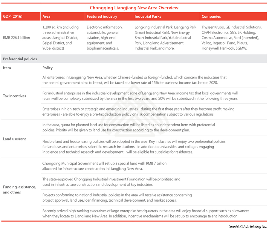 Chongqing Liangjiang New Area has the most offerings of preferential policies, and it emphasizes low costs of production for investors, and the area boasts diversified industry focuses. It is especially attractive for electronic-focused manufacturing, automobiles, new-energy vehicles and high-end equipment manufacturing industries.