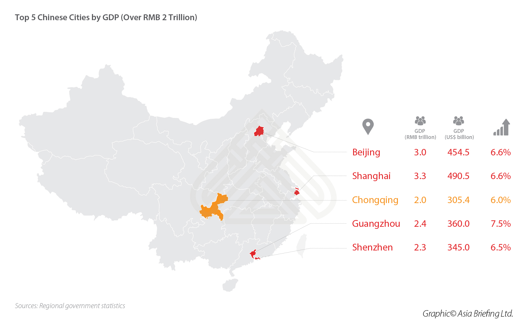 In 2018, Chongqing became China’s fifth city to generate over RMB 2 trillion (US$295 billion) in GDP – after Beijing, Shanghai, Guangzhou, and Shenzhen. A large manufacturing base located by the Yangtze river in the midwest of China, Chongqing’s economy posted 15 consecutive years of double-digit growth beginning in 2002, reaching a high of 17.1 percent in 2010.