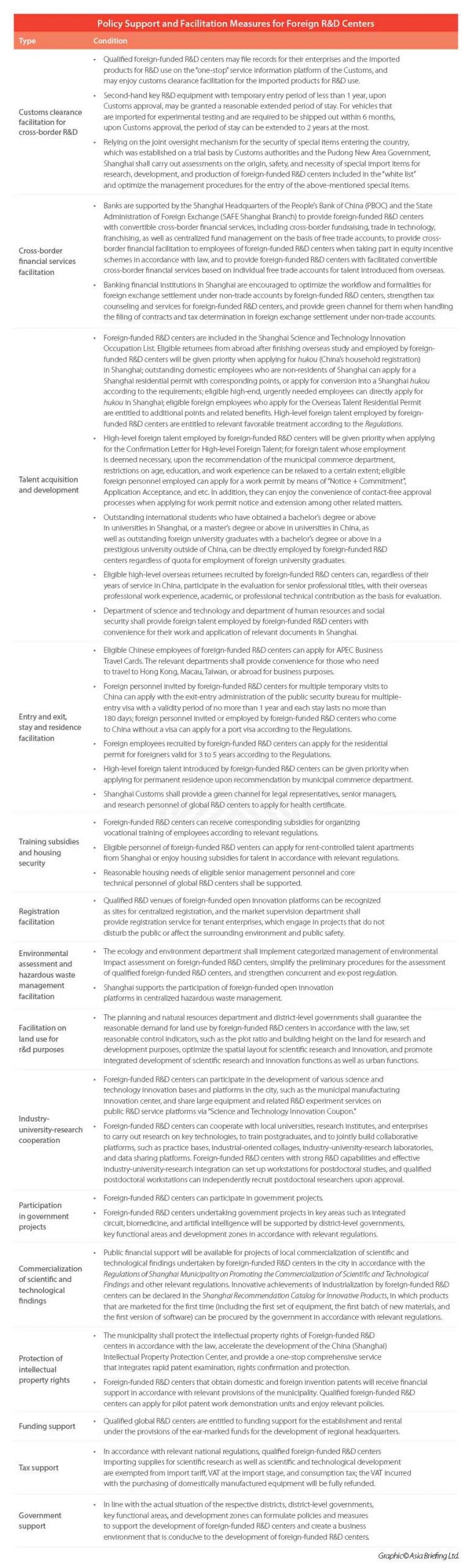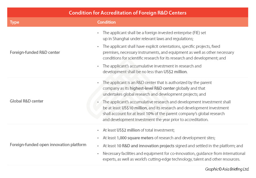For each of the three types of foreign R&D centers, certain conditions must be met, such as a minimum amount of investment in R&D, to be accredited as a qualified applicant. You may refer to the following table for details.