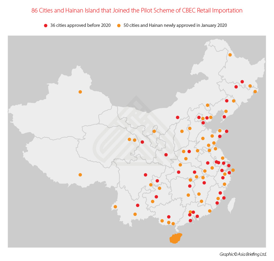 In January 2020, China added 50 cities and the whole Hainan island into the pilot program of CBEC retail importation. Now the country has a total of 86 CBEC pilot cities as well as Hainan island.
