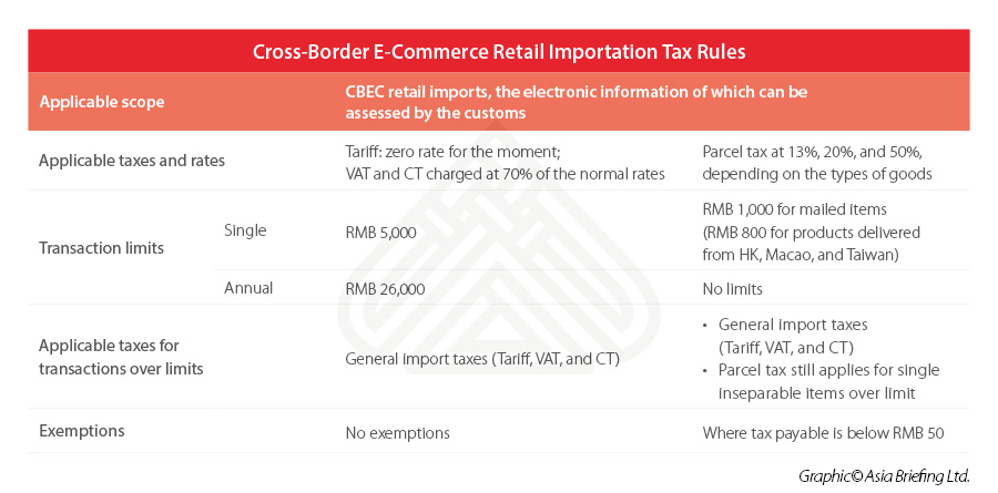 Under certain single and annual transaction limits, retail imported goods on the ‘CBEC positive list’ are deemed as duty-free, and the import VAT and consumption tax (CT) are temporarily levied based on 70 percent of the statutory tax payable.