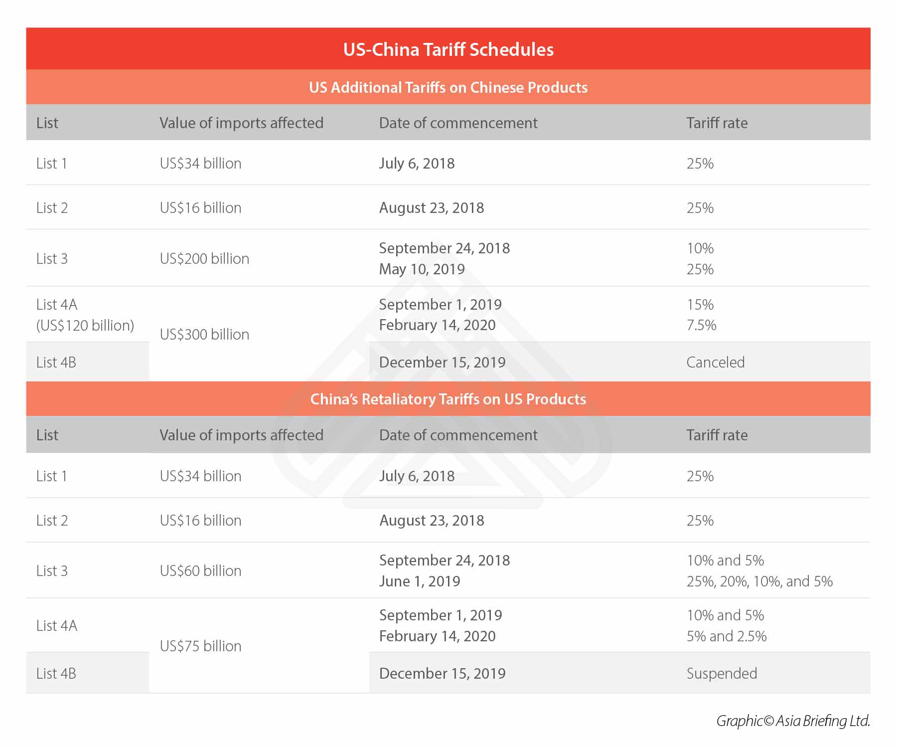 The deal cancels the tariffs originally set to take effect on December 15, 2019 that would have affected mass consumed Chinese-made imports like cellphones, toys, and laptops, among others. In addition, it reaffirms Trump’s commitment to halve the September 1, 2019 tariff from 15 percent to 7.5 percent on US$120 billion worth of Chinese products, including flat-panel televisions, bluetooth headphones, and footwear. However, other tariffs will remain. These include the 25 percent US tariffs slapped on US$250 billion worth of Chinese products and China’s retaliatory tariffs on US$110 billion of US goods. According to US Treasury Secretary Steven Mnuchin, more tariffs will be rolled back in the phase two trade deal, which was brought up at the close of the phase one deal. A summary of the tariffs implemented by both countries can be found in the table below.