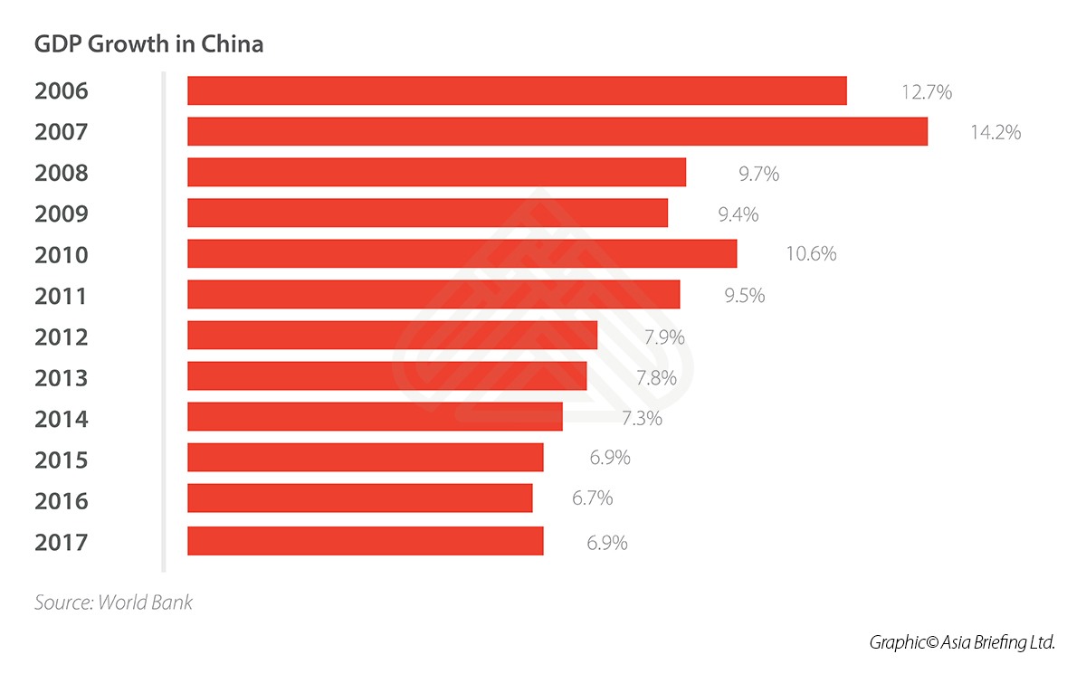 En 2017, le PIB de la Chine a progressé à un rythme plus rapide que prévu de 6,9% grâce à la relance des infrastructures, aux dépenses de consommation et à la reprise de la demande étrangère pour les exportations chinoises. Cela a mis fin à six années consécutives de ralentissement de la croissance du PIB et a rapproché le gouvernement de sa promesse de doubler le PIB de 2010 et les niveaux de revenu par habitant d’ici 2020.