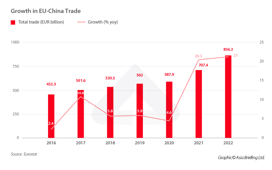 Die EU und China nahmen 1975 offiziell diplomatische Beziehungen auf, als die EU nur aus neun Mitgliedstaaten bestand. In den darauffolgenden Jahrzehnten haben sich die Beziehungen zu einer strategischen Bedeutung für die Weltwirtschaft entwickelt, insbesondere als China im 20 Jahrhundert zu einer Wirtschaftsmacht aufstieg und zum Produktionszentrum der Welt wurde. Die Beziehungen beruhen weitgehend auf dem bilateralen Handel, wobei die EU zunehmend auf chinesische Industriegüter angewiesen ist, insbesondere seit Chinas Beitritt zur Welthandelsorganisation (WTO) im Jahr 2001. Im Jahr 2020 erreichte der bilaterale Handel zwischen China und der EU ein Volumen von rund 1,8 Milliarden Euro pro Tag.