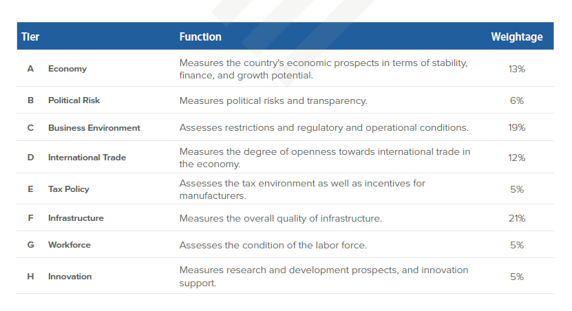 La evaluación del informe se basa en la medición de 48 parámetros distintos organizados en ocho criterios básicos fundamentales: economía, riesgo político, entorno empresarial, comercio internacional, política fiscal, infraestructuras, mano de obra e innovación.