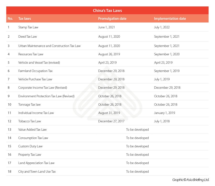 In 2015, the STA released the Guiding Opinions on Comprehensively Promoting the Governing of Taxes according to Law (Shui Zong Fa [2015] No.32), stipulating that China will accelerate the process of upgrading relevant tax regulations into law, to improve the certainty of tax policies, enhance the authority of the tax documents, and ensure the efficiency of tax administration. The draft VAT law is therefore a part of China’s efforts to codify VAT within China’s broader tax regime. There are several other pieces of tax legislation that are similarly in need of development, as can be seen in the table below.