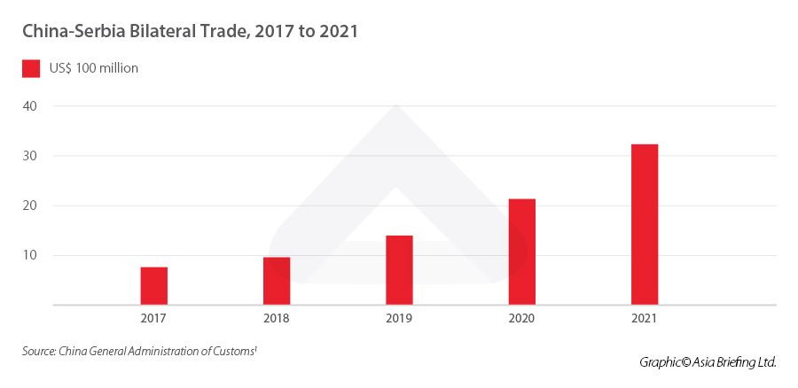 China is one of Serbia’s largest trading partners and its largest economic partner in Asia. Bilateral trade has accelerated rapidly in recent years despite economic slowdowns caused by the COVID-19 pandemic. According to statistics from China’s MOFCOM, bilateral trade between Serbia and China reached US$3.2 billion in 2021, at a growth rate 54.3 percent from the previous year. Of this, China’s exports to Serbia reached US$2.24 billion, up 37.9 percent from the previous year, while imports from Serbia reached US$995 million, up 99.7 percent from 2020.
