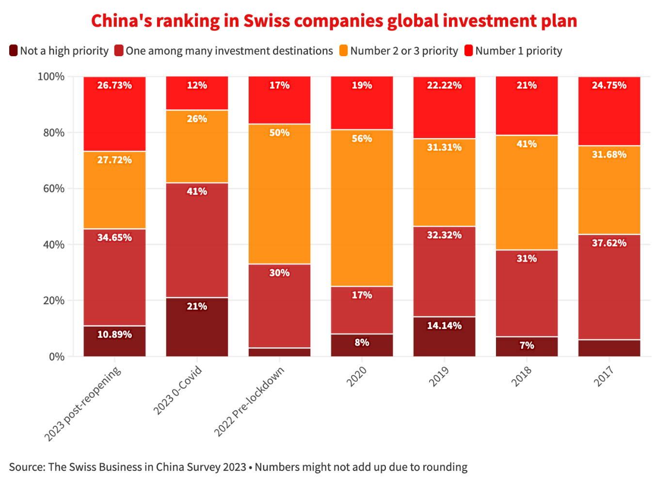 Darüber hinaus bietet die Swiss Business in China Survey 2023 , die von der Seismo Press AG in Zusammenarbeit mit der Schweizer Handelskammer und anderen Partnern veröffentlicht wurde, wertvolle Einblicke in die sich entwickelnde Landschaft für in China tätige Schweizer Unternehmen. Nach der Entscheidung der chinesischen Regierung, die Null-COVID-Lockdown-Beschränkungen im Januar 2023 aufzuheben, verzeichneten Schweizer Unternehmen einen deutlichen Vertrauenszuwachs. Dieser erneuerte Optimismus wird jedoch durch einen vorsichtigeren Investitionsansatz gedämpft, der ein sich veränderndes Wettbewerbsumfeld und globale Unsicherheiten widerspiegelt.