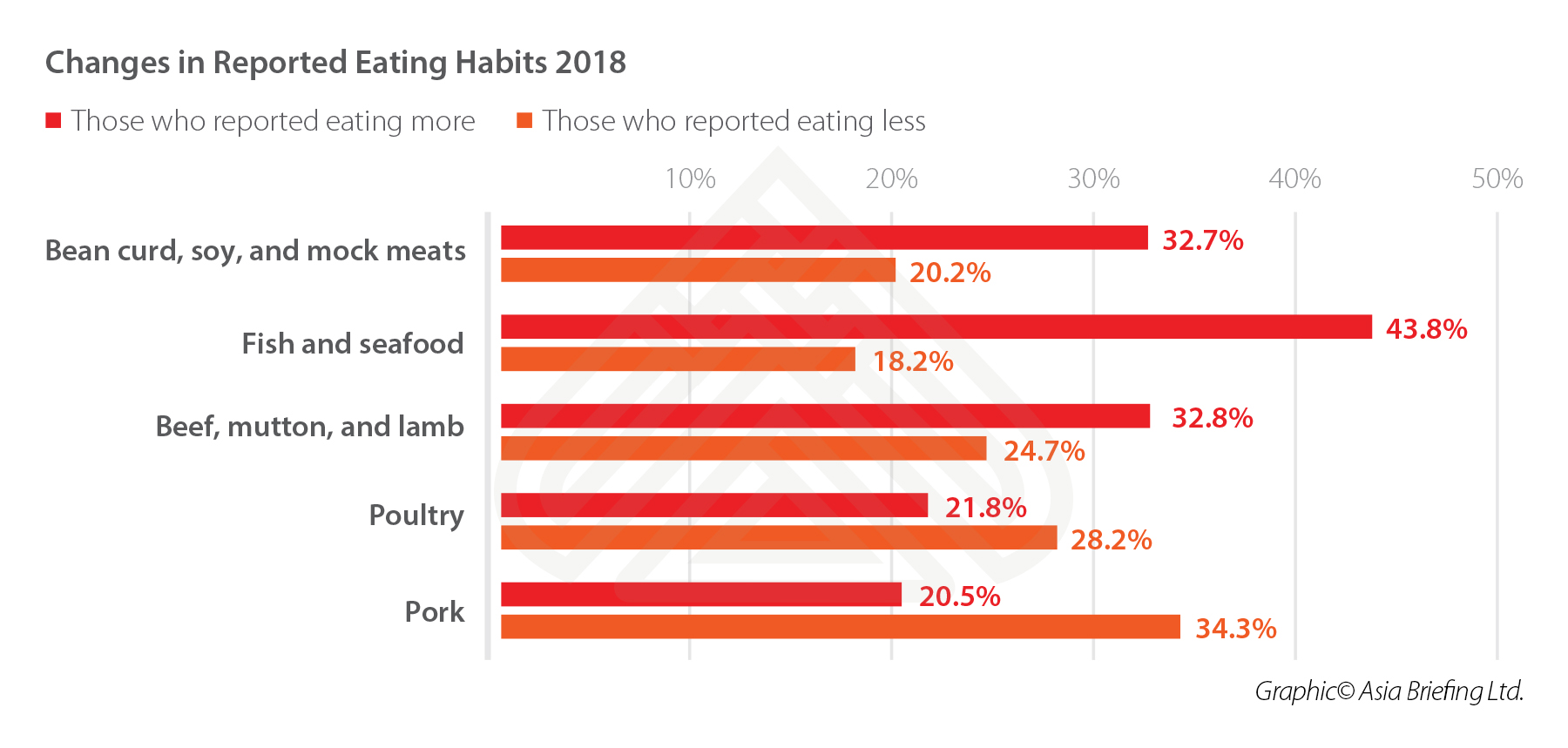 In a 2018 survey conducted by the New Zealand Institute of Plant and Food Research, 2,000 respondents, mainly from tier-one Chinese cities, reported that they were eating less pork and poultry. On a net basis, 13.8 percent reported eating less pork and 6.4 percent were eating less poultry.