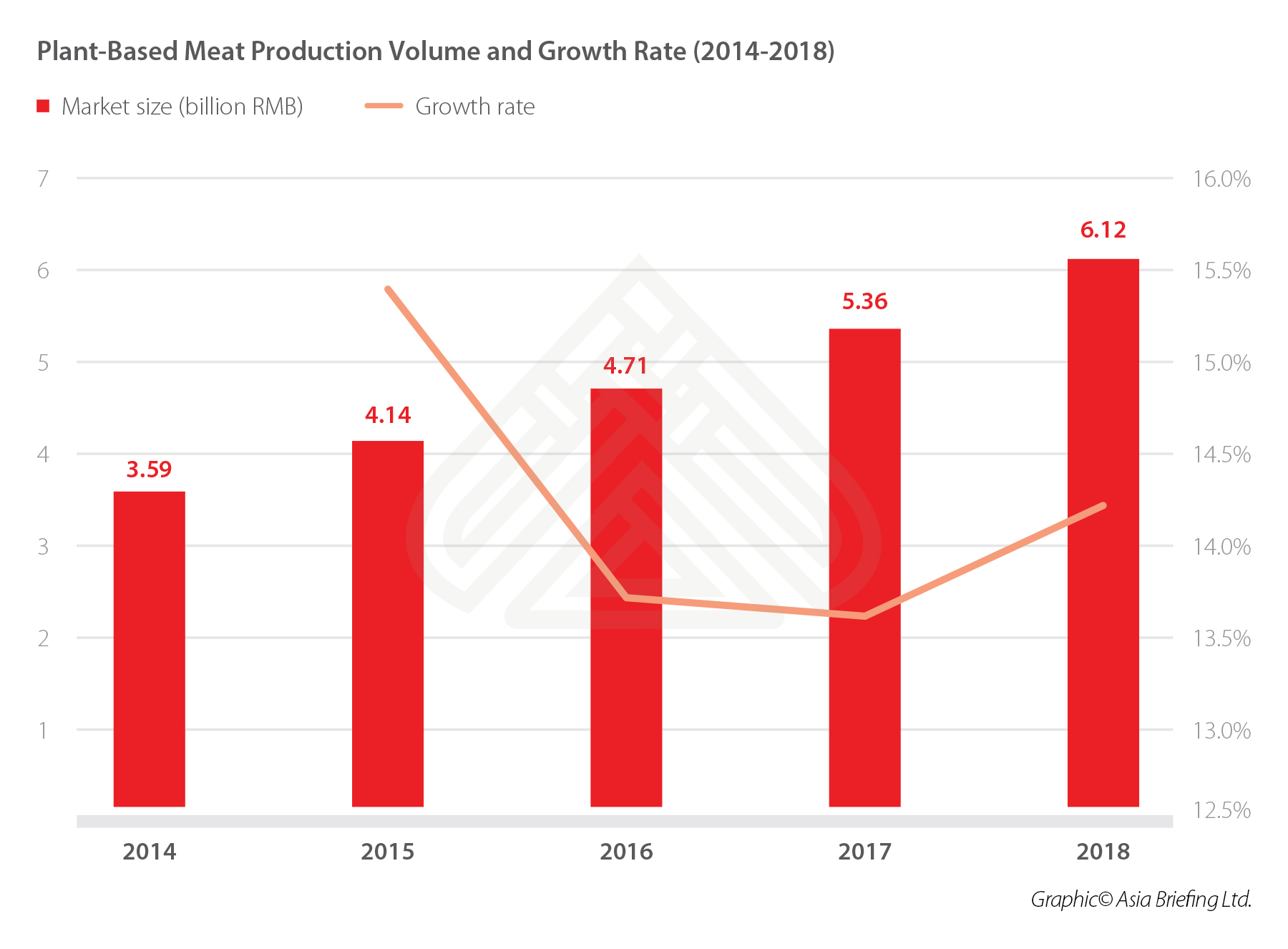 According to an industry report by The Good Food Institute, a non-profit in the United States, the Chinese plant-based meat market has grown at an annual rate of 14.3 percent since 2014. Although the base of China’s GDP is much larger, this is around twice the size of the national annual GDP growth rate for the same period.