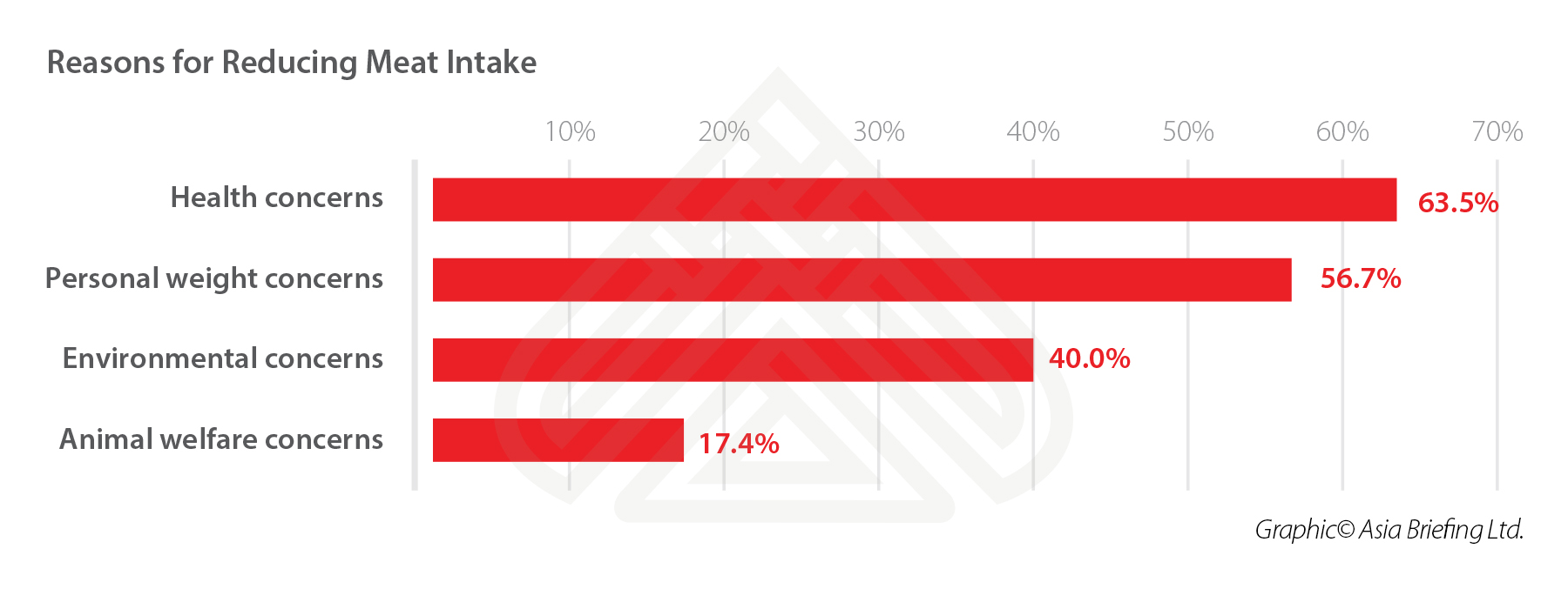 The major reasons given for reducing meat intake were perceived health benefits (63.5 percent of respondents), managing personal weight (56.7 percent), and environmental concerns (40 percent). Only 17.4 percent claimed they reduced their meat intake due to concerns for animal welfare.