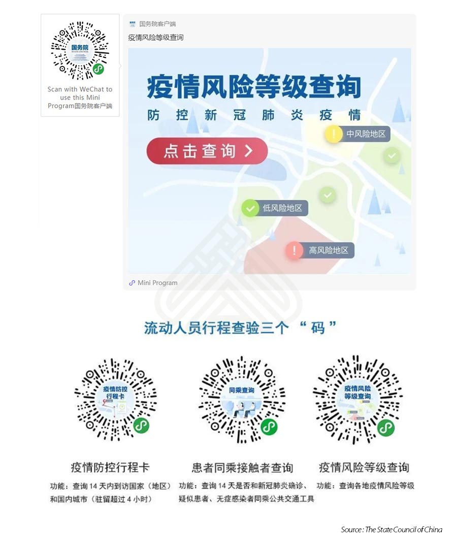 La Comisión Nacional de Salud de China lanzó un mini programa WeChat (ver el gráfico a continuación) para que los ciudadanos verifiquen el nivel de riesgo de infección de un área especial, para que el personal de la epidemia revise los países y ciudades visitados (permaneciendo durante más de cuatro horas) por el viajero durante los últimos 14 días. El programa también permite a los usuarios comprobar si utilizaron el mismo transporte público que los casos confirmados durante los últimos 14 días. Similar al esquema de colores del sistema de códigos de salud, el sistema de nivel de riesgo de brote otorga color “verde” a las áreas de bajo riesgo, “amarillo” a las áreas de riesgo medio y “rojo” a las áreas de alto riesgo. Los niveles de riesgo se evalúan en función del número de casos nuevos.