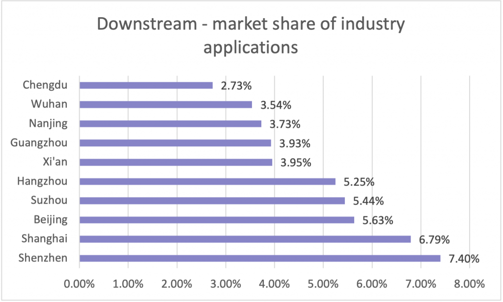 Compared to upstream and midstream segments, the concentration of downstream industry applications is lower. This presents an opportunity for more cities to leverage the “AI+” concept and drive AI industrial development. China holds significant potential for expanding businesses in the downstream segment.