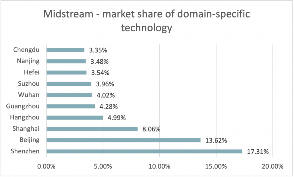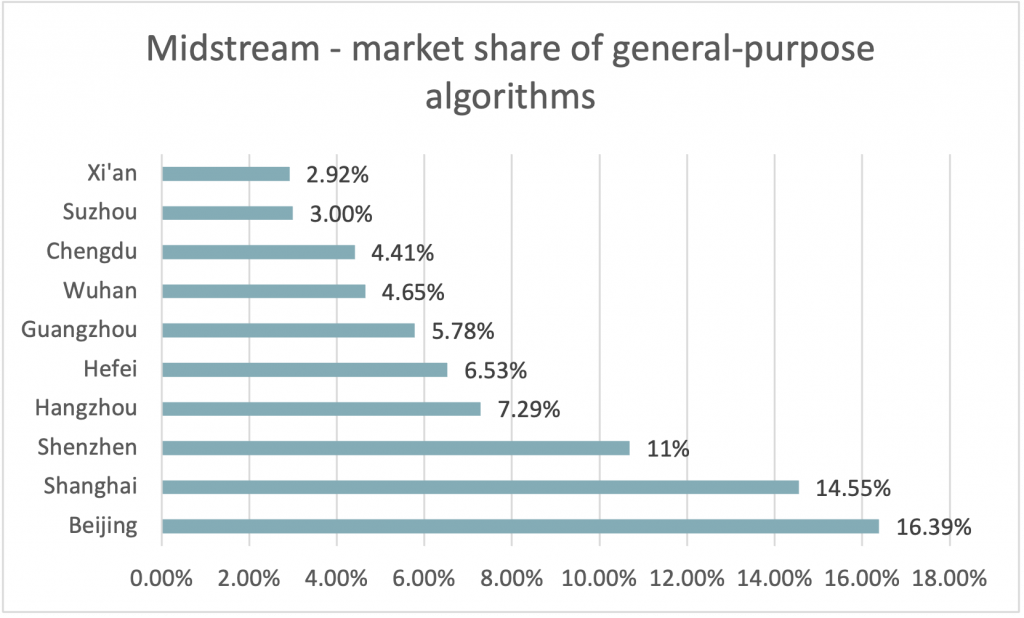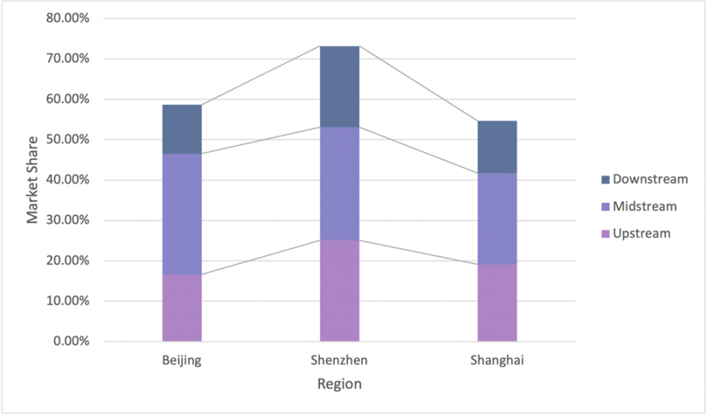 The distribution of upstream, midstream, and downstream segments in the AI industry across China reveals the comparative regional advantages in AI development. Beijing, Shanghai, and Shenzhen stand out in all three segments have collectively provided the thrust to lead China’s AI industry development.