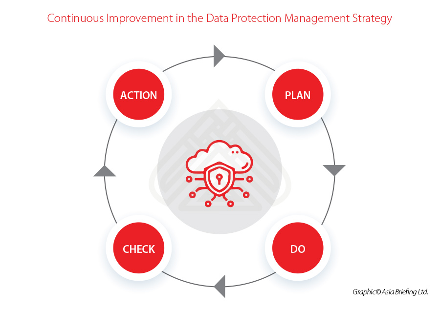 - Continuous data protection management – the company should take organizational measures to provide enough resource for building the data protection management system through all business processes, specifying the person in charge of data security and related management agency to fully bear the data security responsibility.