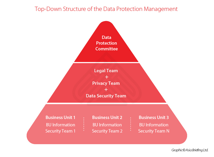 The company needs to assign the resource and build up the data protection management team with a top-down structure, such as the “information security committee”, which involves legal, technical, and business departments on the top, followed by the professional team from the legal, privacy, and IT departments. For big companies, the information security team of each business unit needs to be involved as well.