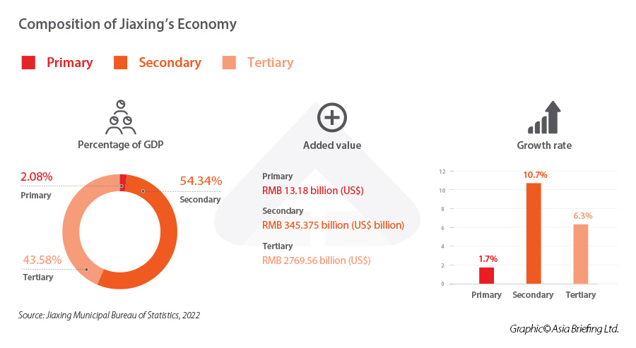 In 2021, the GDP of Jiaxing reached RMB 635.53 billion (US$100.35 billion), growing 8.5 percent year-on-year, higher than in previous years. Jiaxing also has a sizable consumer market with an average disposable income of RMB 69,839 (US$10,342), almost 50 percent higher than the national average. In addition, total retail sales of consumer goods in the city rose to reach RMB 227.504 billion (US$33.691 billion) in 2021.Secondary industries make up a majority (54.34 percent) of Jiaxing’s GDP, followed by services (43.58 percent), and finally, primary industries, which only account for 2.08 percent of the city’s GDP.