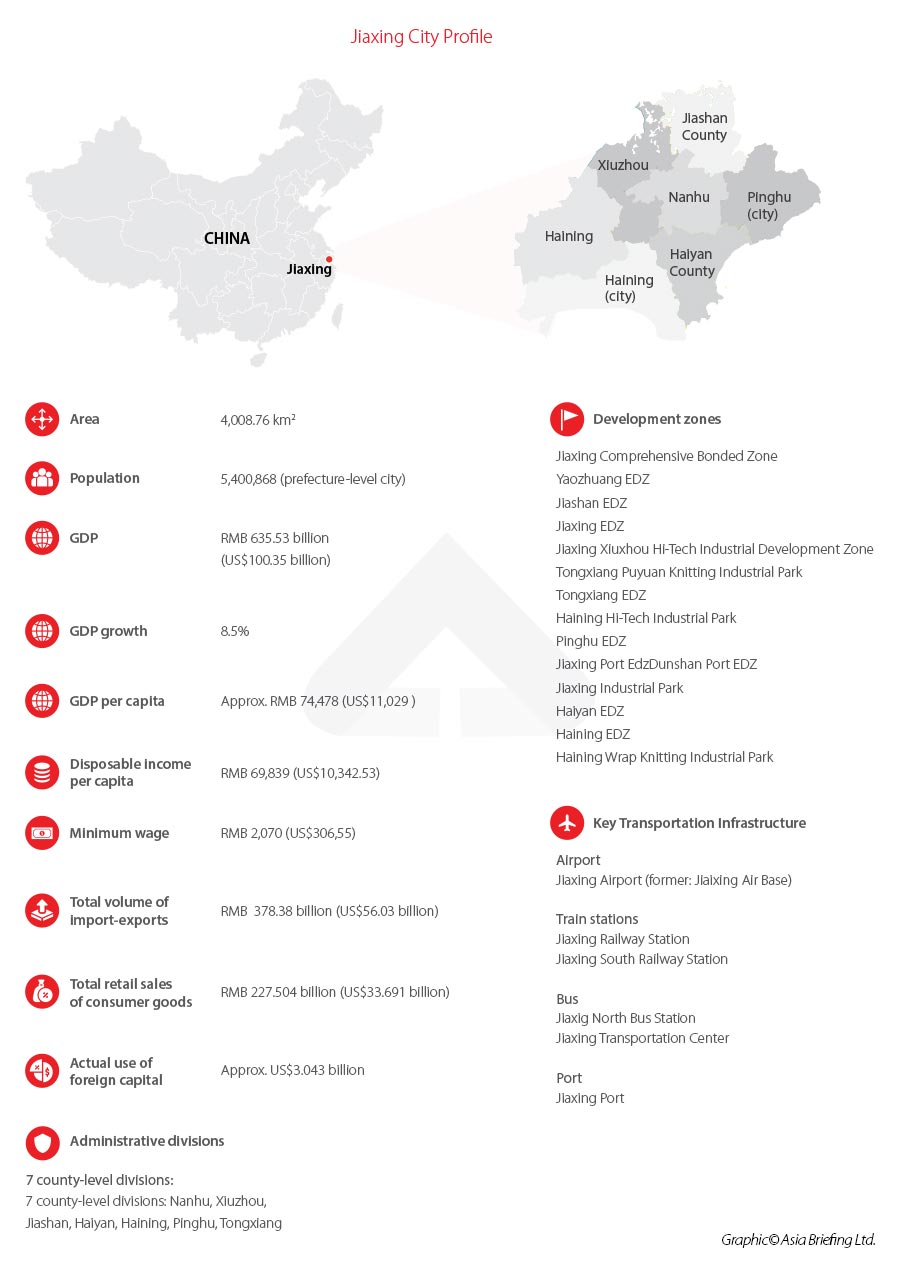 Jiaxing, traditionally known as ‘the home of silk’, is a prefecture-level city of 5.4 million people located in East China’s Zhejiang province. With an area of 4,223 square kilometers, Jiaxing is surrounded by Suzhou to the north, Shanghai to the east, Hangzhou and Huzhou to the west, and Hangzhou Bay to the south. In terms of infrastructure, Jiaxing is well developed with a deep-water port, high-speed rail links, and six expressways linking to the wider Yangtze River Delta region.