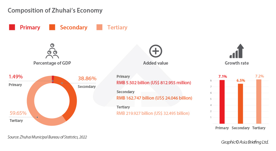 In 2021, the city's GDP reached RMB 388.175 billion (US$57.48 billion), scoring a year-on-year increase of 6.9 percent. In terms of GDP contribution, Zhuhai’s secondary and tertiary sectors made up the largest share, with a contribution rate of 38.86 percent and 59.65 percent, respectively, while the primary sector accounted for only 1.49 percent. In particular, the added value of the service sector reached RMB 155.146 billion (US$22.97 billion), accounting for 40 percent of the regional GDP.