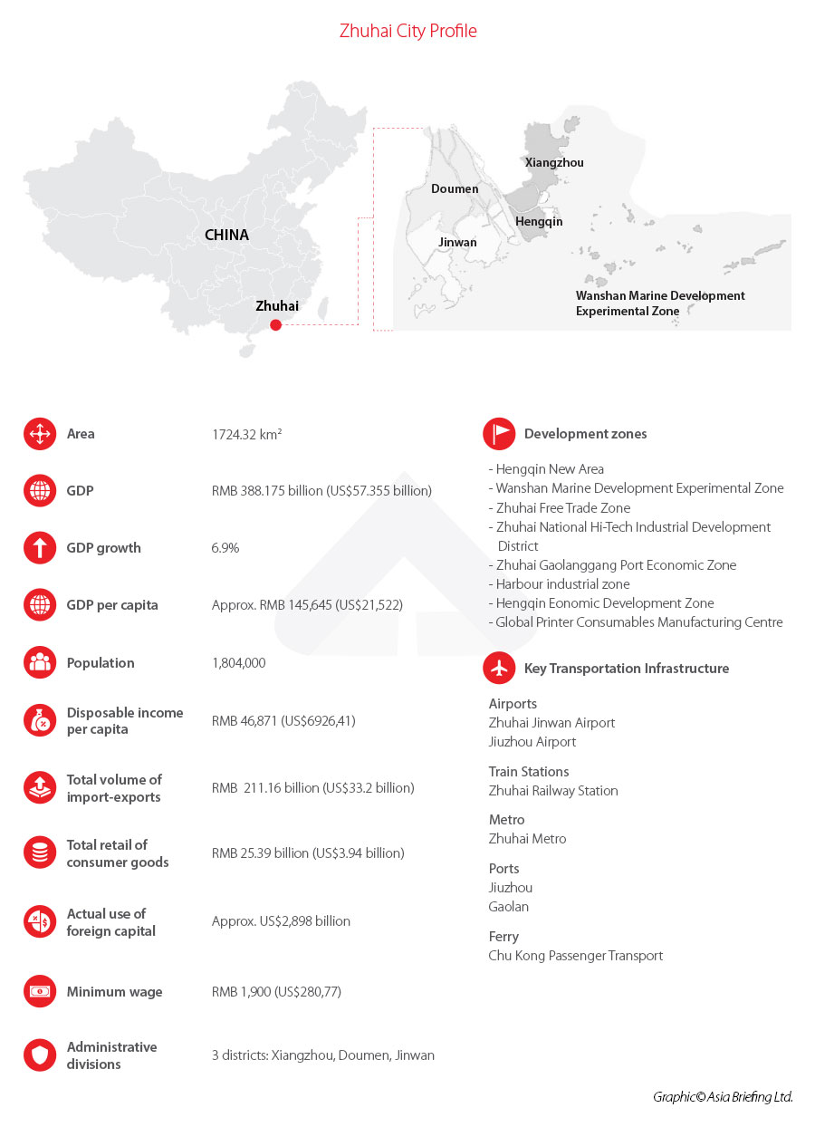 The Zhuhai-Macao Cross-Border Industrial Zone was established in 2003 and opened for business in 2006. The area was set up to strengthen economic ties between Guangdong Province and the former Portuguese colony and is considered among the driving factors behind Macao's long-term stability and growth.The industrial zone covers a total area of 40 hectares (99 acres) and it falls into the Zhuhai FTZ in Wanzai. The area is also located less than 1 km away from the Hong Kong-Zhuhai-Macao Bridge's passenger transport exit and is in close proximity to the intercity MRT Zhuhai Station as well as the Zhuhai (Jinwan) Airport. It is also close to some of Zhuhai's most popular retail areas, including Hengqin, Shizimen Central Commercial District, and Gongbei's core business area, making it a suitable entry point for imported products onto the Chinese Mainland.