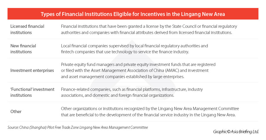 The Lingang measures specify the types of financial institutions that are eligible for the incentive policies.